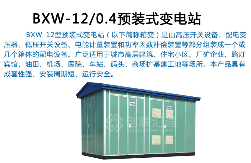 BXW-12型預(yù)裝式變電站(以下簡稱箱變)是由高壓開關(guān)設(shè)備、配電變壓器、低壓開關(guān)設(shè)備、電能計量裝置和功率因數(shù)補償裝置等部分組裝成一個或幾個箱體的配電設(shè)備。廣泛適用于城市高層建筑、住宅小區(qū)、廠礦企業(yè)、路燈、賓館、油田、機場、醫(yī)院、車站、碼頭、商場擴基建工地等場所。本產(chǎn)品具有成套性強、安裝周期短、運行安全