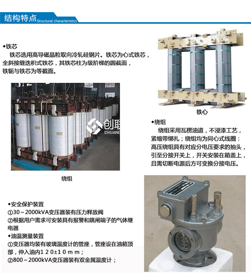 油浸式電力變壓器,采用新型絕緣結(jié)構(gòu),提高了抗短路能力,鐵芯由高質(zhì)量冷軋晶粒取向硅鋼片制成;高、低壓繞組選用優(yōu)質(zhì)無氧銅線并采用多層圓筒式工藝結(jié)構(gòu);所有緊固件均采用特殊防松處理,機(jī)械強(qiáng)度高。波紋油箱殼體以自身彈性適應(yīng)油的膨脹是永久性密封的油箱,已被廣泛地應(yīng)用在各配電設(shè)備中。